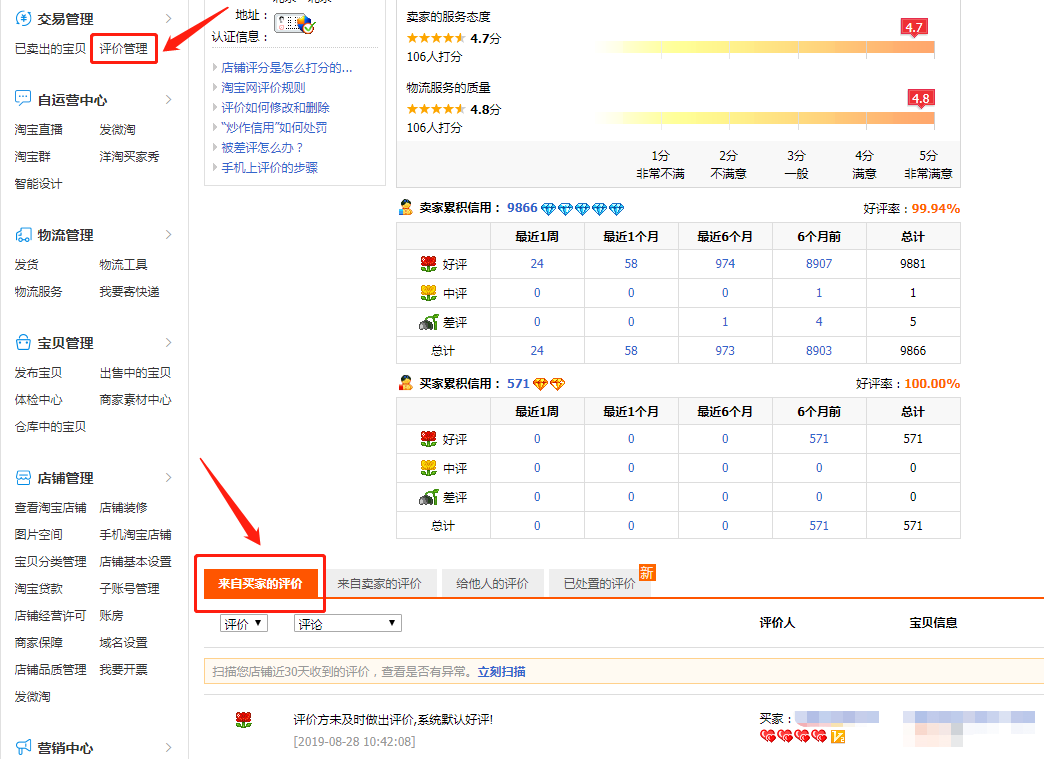 淘寶賣家(jiā)評價管理(lǐ)頁面