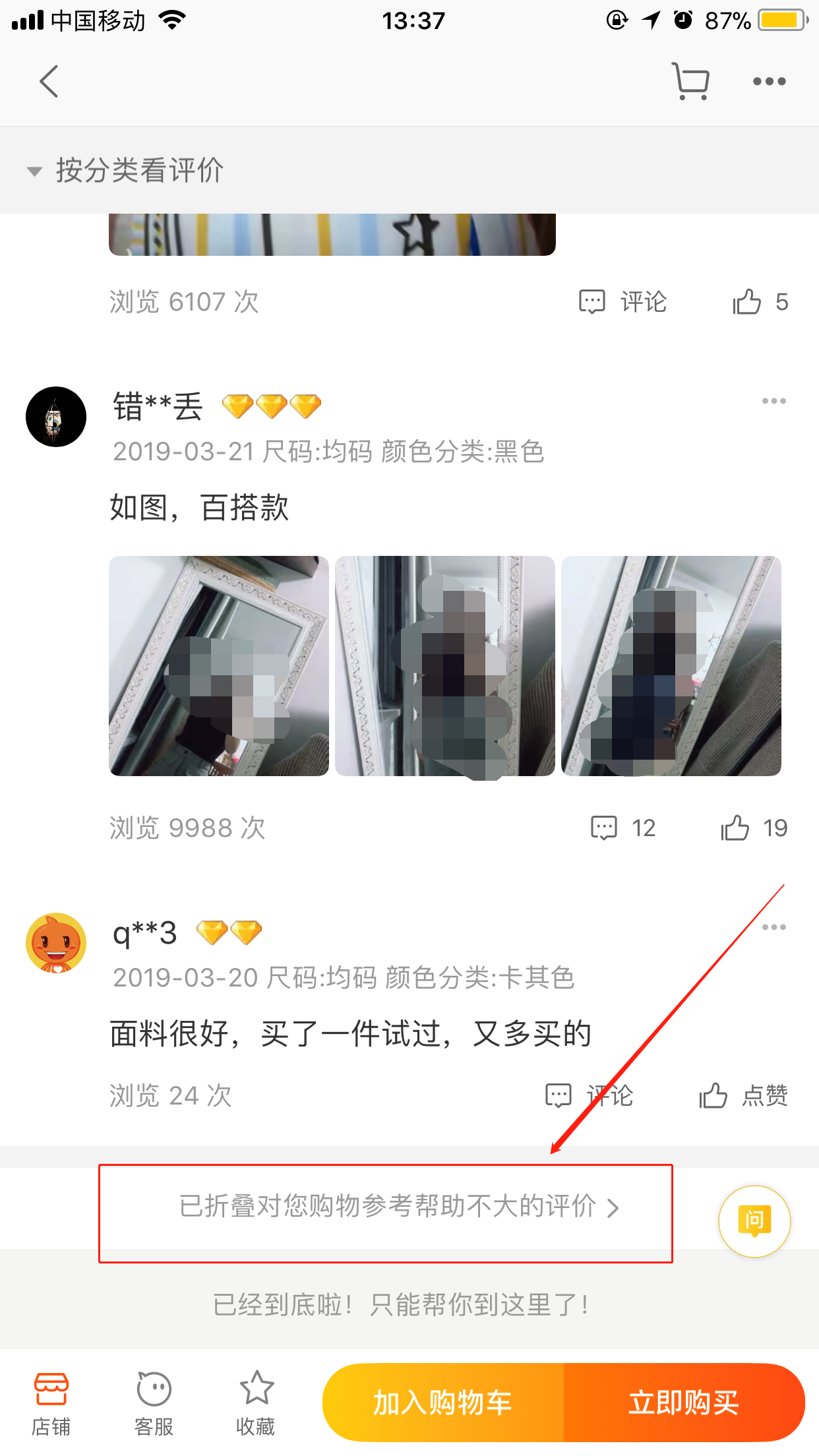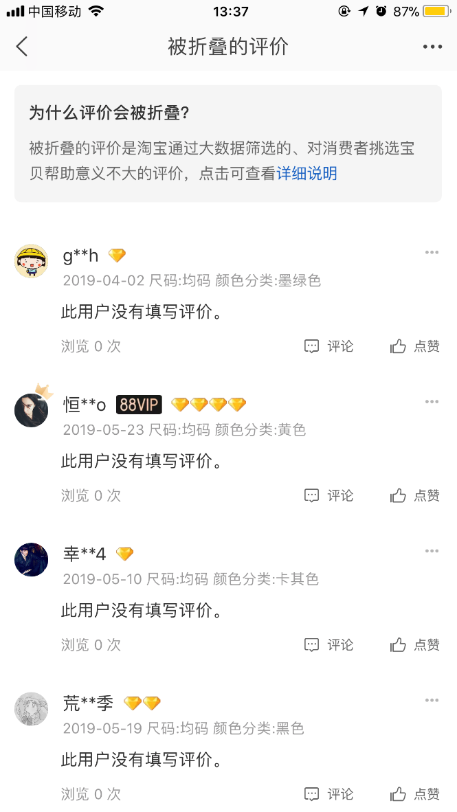 、與商品無關、沒有(yǒu)參考價值的(de)評價,比如(rú)簡單評價個(gè)“好(hǎo)”字或者蹭淘氣值相(xiàng)關的(de)內(nèi)容就(j☆iù)有(yǒu)可(kě)能(néng)會(huì)被折疊起來(lái)。